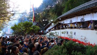 当山では午前10時より僧侶・山伏によるお練りで境内が清められた後、本堂前にて大護摩修行が執り行われます。一年間参拝者が書きためられた護摩木数万本が浄火で梵焼され、厄を払って願いが成就するよう祈念されます。